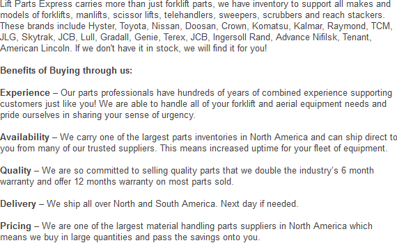 We offer you the best prices on all parts for your fleet of forklifts. Phone today to get a price quote on one of the parts or attachments we offer. Call us at: